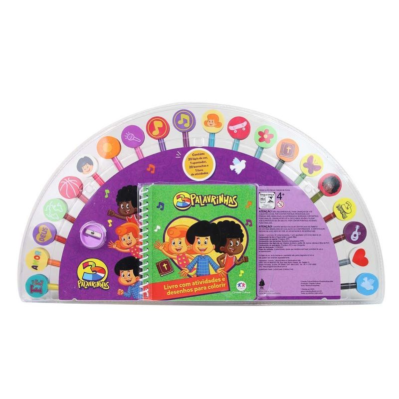 Encante-se e divirta-se a valer com este kit de colorir de 3 Palavrinhas! Além de um livro cheio de aventuras, você vai encontrar lápis de cor, borrachas coloridas e em diferentes formatos, e um apontador! Não é demais?