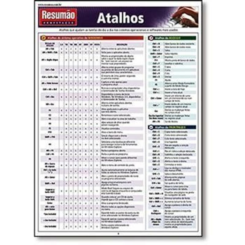 Listas com os atalhos que ajudam as tarefas do dia a dia nos sistemas operacionais e softwares mais usados, como: Windows, Access, Frontpage, PowerPoint, Publisher, InDesign. QuarXpress, Quicken, Unix e Linux, Internet Explorer, Mozilla e Firefox, Opera e Mac OS, da Apple. E mais: uma tabela para teclados numéricos de PCs com comandos específicos para fazer letras, números e símbolos.