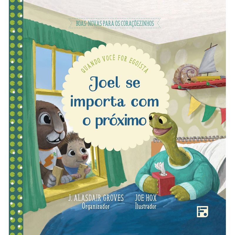 A tartaruga Joel já começa o dia pensando mais em si mesmo do que nos outros. Ele não só fi ca irritado porque a tosse de sua irmã Laura o mantém acordado, mas também se gaba para todos os seus amigos sobre seus sucessos. Somente quando fi ca doente e seus amigos cuidam dele é que Joel aprende a olhar para Deus e para os outros. Editado pelo conselheiro Alasdair Groves, Joel se importa com o próximo ensinará às crianças como Deus se importa conosco e deseja que busquemos sua ajuda para que também nos importemos com os outros.