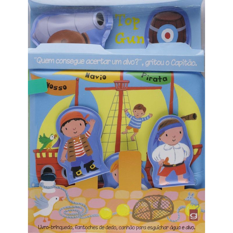 Com textos e ilustrações de Emily Bolam, este livro de banho – com três dedoches, um canhão para esguichar água e um alvo – encanta pela possibilidade de a criança interagir com a narrativa. “Três barris, um, dois, três”, grita o Capitão Bones. “Quem consegue acertar um alvo para mim?” Jimmy, Stig e Sally: esses três personagens vão provar ao Capitão Bones quem tem a melhor pontaria. Começam os tiros… Bum Bum Bum. Quem vencerá? E a imaginação da criança começa a trabalhar. Este livro-brinquedo estimula a percepção, a criatividade e a coordenação motora.