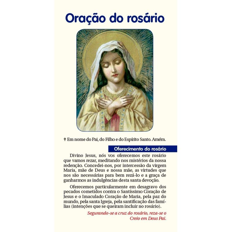 A Oração do Rosário nos aproxima de Deus e de Maria Santíssima Com este folheto você poderá rezar o terço sempre que precisar tendo um importante auxílio que de forma didática ensina quais as orações que devem ser rezadas quais são os Misteacuterios do Rosário as Ladainha de Nossa Senhora e como se deve rezá-lo para assim aproximar mais sua alma de Deus