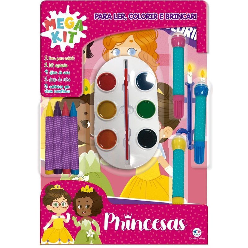 Prepare-se para brincar com lindas princesas! Divirta-se com um livro para ler e colorir, gizes de cera, um estojo de aquarelas com seis cores, canetinhas com carimbos acoplados e um jogo da velha para recortar e brincar!