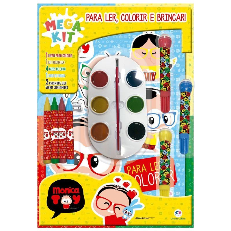 Prepare-se para a diversão! Com os personagens favoritos da criançada, o Kit Super Color é cheio de cores e aventuras. Divirta-se com um livro para ler e colorir gizes de cera uma paleta de aquarela com seis cores canetinhas com carimbos acoplados e um jogo para recortar e brincar!